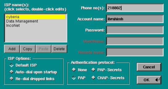 Information: The user can create ISP entries, set the default ISP, set auto-dial and re-dial on disconnect options and the authentication protocol (none, PAP, PAP-Secrets or CHAT-Secrets). In Figure 2, X-ISP is configured to connect to any of the three ISPs: Cyberia, Data Management or IncoNet (actual ISPs in Lebanon) with Cyberia as the default ISP.