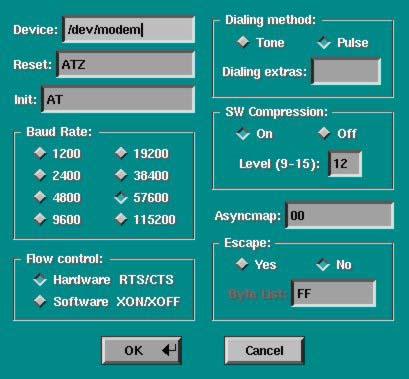 Communication Options: These control the settings of the modem device and its properties (Reset and Init strings, baud rates and flow control), dialing method and asyncmap, software compression, serial port baud rate and flow control. All of these options have an initial default value.