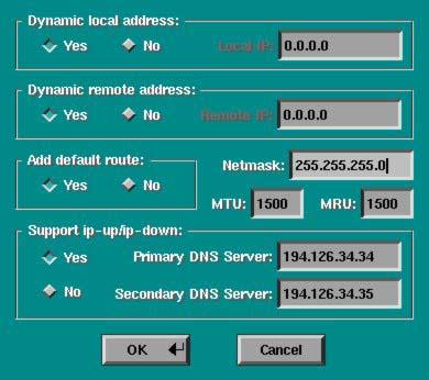 TCP/IP Options: controls the settings of dynamic local and remote addresses, netmask and DNS.