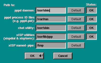 Paths Setup: enables editing the paths to the pppd daemon, the location where pppd saves its process ID files, the chat utility, the xispdial and xispterm utilities, and where XISP will keep the named pipe node used for communicating with its components.