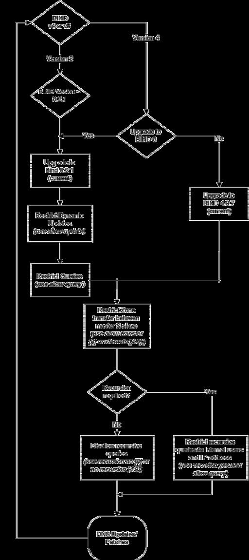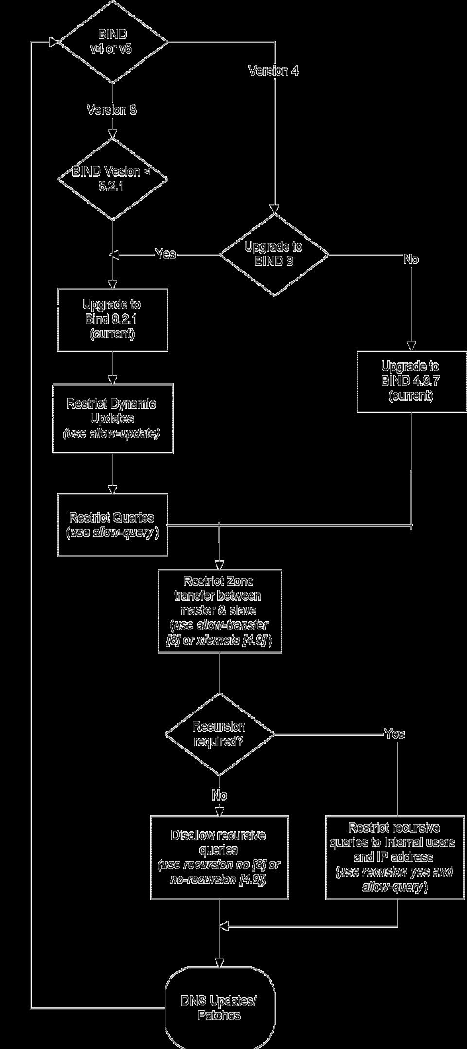 This section focuses on measures that name-server administrators can take to secure their DNS environment on UNIX. Figure 1 displays a flow-chart-based approach to securing BIND. The following measures, when implemented properly, will assist in securing BIND.