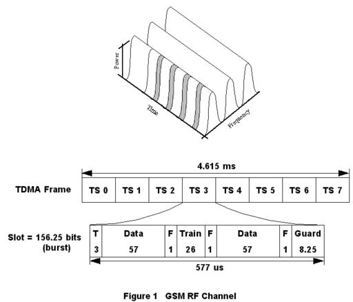 If you are traveling from Italy to France, it is likely that your mobile phone is a Global System for Mobile communications (GSM) cellular telephone. GSM is a worldwide second-generation digital cellular standard. GSM offers many voice and short message services such as calling line ID, call barring, call forwarding and advice of charge. As shown in Figure 1, GSM's radio frequency (RF) interface is comprised of 200KHz bandwidth carriers divided into eight time slots. A time slot is one channel which can carry digitally compressed voice at 13Kbps. On a data call, this same time slot can carry up to 14.4Kbps of circuit-switched data.
