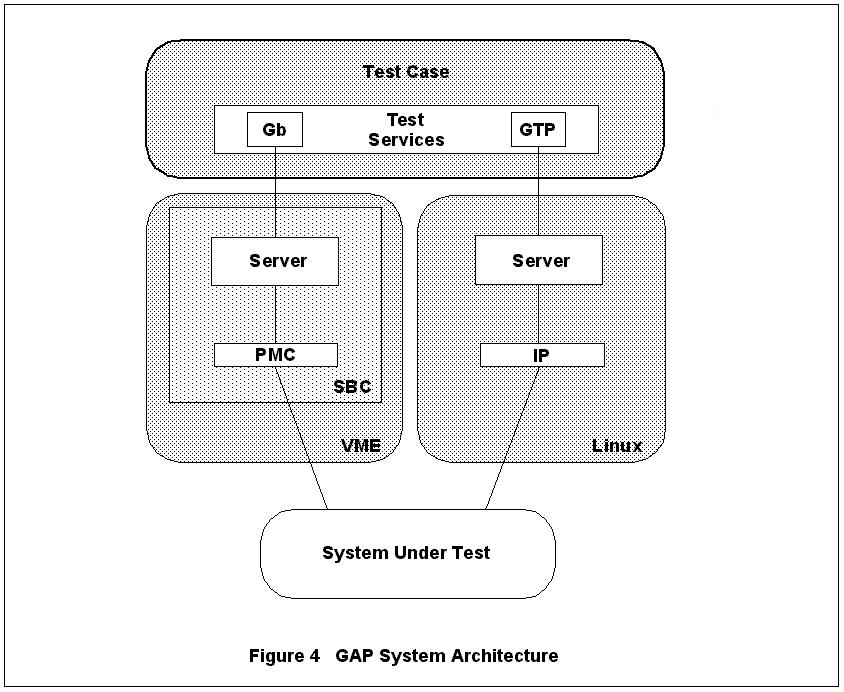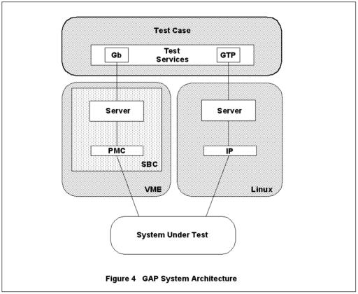 The server portion of the Gb test interface is a distributed application consisting of two primary components. One component resides on a PowerPC single board computer (SBC) housed in a VME chassis running a commercial RTOS. This component drives a frame-relay interface running on PCI (peripheral component interconnect) Mezzanine cards that support multiple T1 or E1 carriers. The second component performs resource management, proxies the frame-relay services and implements the BSSGP (base station system GPRS protocol) and NS (network service) layers of the Gb protocol stack. Thanks to the diversity of TTF, this component runs on either a PC running Linux 2.0 or a PowerPC SBC target running an RTOS.