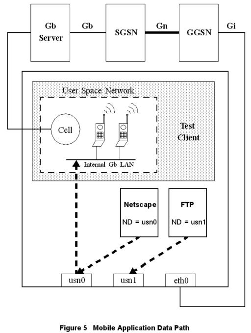 In the arrangement pictured in Figure 5, the test case running on the Linux test-case machine brings up a tunnel using GPRS signaling paths. Once the tunnel is established, the test-case machine creates an IP alias for the test case's Mobile IP. The test case machine is multi-homed on the user-space Gb LAN and the Gi LAN. The test case uses IP applications or sockets to generate real IP traffic through the Gb test server to the SGSN, through the Gn test server, on to the Gi LAN, and possibly to the test-case machine's Gi interface.