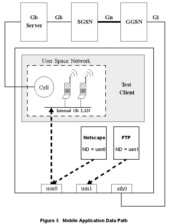 The test-case machine sits on both the user-space internal Gb LAN and the Gi LAN. In an example where the test case has two mobiles, each with an active context, several routing problems become immediately apparent. In this case, the user might want to launch two instances of Netscape, “binding” each instance to a different mobile's context (i.e., IP address). If one of these Netscape sessions opens a TCP socket to a Gi LAN web server, the kernel has three choices for routing the TCP packets: the kernel could send the packets to either one of the two mobile's USN devices, or to the Gi LAN's real Ethernet device.