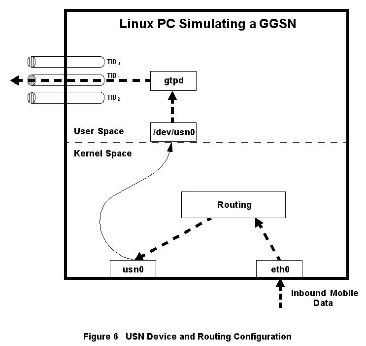 The Linux machine on which the Gn test server resides acts as a gateway for the mobile's IP subnet. The routing tables are configured so that the mobile-bound IP packets are routed to the USN device. When the kernel sends packets to this device, our user-space daemon (gtpd) triggers and reads the packets from the USN character-device file (e.g., /dev/usn0). Our daemon then places them in an enveloping GTP message and sends the message to the SGSN's GTP port. Before starting this development item, we spent a large amount of time admiring our brilliance.