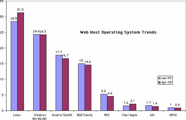 Gains by Linux are old (if not Red) hat by now. Still, it's gratifying to see the numbers. Here are the latest (April 1999) from The Internet Operating System Counter (http://leb.net/hzo/) in graphical form.