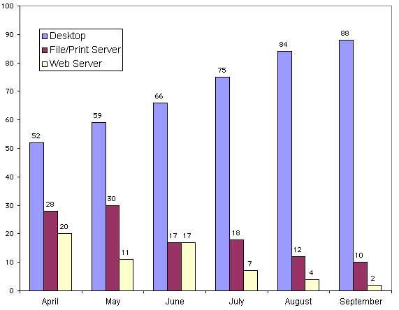 Another quarter, another major advance in Linux' move to the desktop—at least if we judge from service calls. Last September, we reported that Linuxcare noticed a 27% increase in the number of desktop incidents, while service calls for file, print and web servers went down. Now we have the third-quarter numbers, and the trend continues. To show the dramatics, here's a graph.