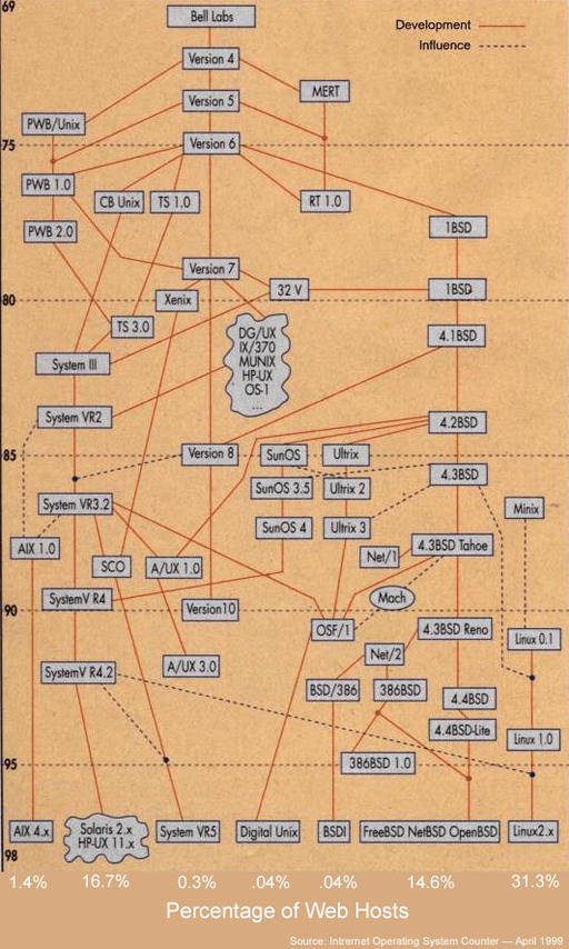 One of the old objections to UNIX was there were so many variants. The fact that lex, yacc, vi, troff and other commands ran uniformly across all of them didn't cut the ice. The plate of spaghetti here represents most of the variants and the cross-fertilization. Minix shouldn't be free-standing: it arises out of V7 from Bell Labs. I miss Dell UNIX, the best n86 version of SVR4.