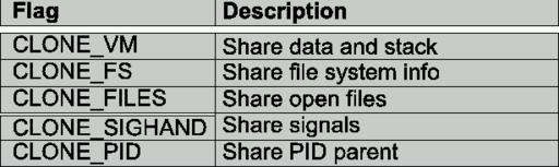 The clone system call has several flags to indicate how much will be shared between threads. Figure 2 lists each flag.