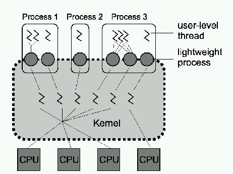 With this model, any process may have many user-level threads. These user-level threads may be scheduled and switched among kernel-supported lightweight processes without the intervention of the kernel. Each LWP is connected exactly to one kernel-level thread. Many LWPs are in a process, but they are needed only when threads need to communicate with the kernel; if one blocks, the others can continue to execute within the process. In Solaris, users can create new threads permanently bound to an LWP.