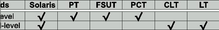 The tests were all performed ten times and the mean of the measurements was taken as the result for the test. This result is an indication of the performance of the function being evaluated. We have considered average values, because they are more representative of the performance the user can obtain from the machine. Other authors consider minimum values, because they are supposed to be free from the influence of the operating system and other users. The tests were taken with only one user on the machine. All tests compared the performance obtained for Solaris threads, Provenzano threads (PT), FSU_Pthreads (FSUT), PC threads (PCT), CLthreads (CLT) and LinuxThreads (LT). Threads created in Solaris are permanently bound to an LWP to take full advantage of the hardware platform used.