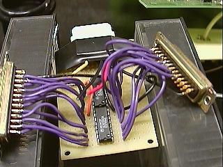 The stepper motors are driven by Darlington-pair transistors (see http://www.doc.ic.ac.uk/~ih/doc/stepper/ for a discussion on stepper-motor control). This allows for great control, at the expense of hefty timing requirements. In the Linux kernel, we can find floppies driven every three to eight milliseconds. Empirically, given the load on our motors, we can sometimes move more than twice a second. We've hooked them up to the parallel port. The parallel port has eight data lines and four control lines which can be used for output. This is just sufficient to control three stepper motors at four controls/motor. If we needed more motors, we would have to use a different type of controller. Figure 1 shows the microscope looking at the focus mechanism. Figure 2 shows the circuit driving the motors. It uses two ULN2003A chips and is powered by a spare computer power supply.