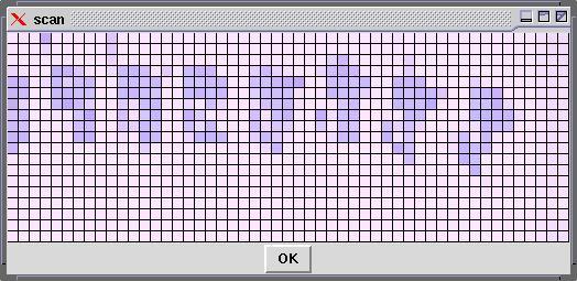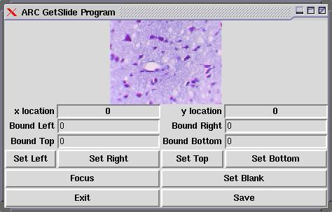 There are currently two interfaces to the physical “scanner”: one for grabbing an overview (see Figure 3) of the entire slide, at 25 bits per inch (i.e., the microscope's objective is moved 1mm at a time, and the average color at that point is saved), and another for grabbing a specified region on the slide. In the second case, because of the low speed of directory listings (ls takes quite a bit of time if there are 2000 files), a directory is created for every column scanned. Figure 4 shows the interface used to scan in a rectangular region. The user can use the cursor keys to move the slide, and then select the boundaries.