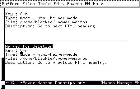 What you see in this buffer is your power-macros, each separated with a line of dashes. Many keys have special meanings in this buffer (just like the keys have special meanings in the buffer-managing buffer or in the dired buffer).