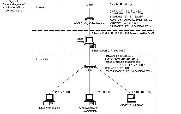 One of the TCP/IP settings on our PCs, regardless of the operating system, is the “default route”. When the destination IP address cannot be found on our local LAN (this is determined by the subnet mask), then the default route is used. The default route in this example will point to the IP address of the NIC on the local LAN side of the firewall (Ethernet 0 in Figure 1). This IP address usually ends in 1. For example, if you have a local LAN with a network address of 192.168.0.0 and a subnet mask of 255.255.255.0, you have 192.168.0.1 to 192.168.0.254 available for local IP addresses (see Resources for more information on the Linux NET-3-HOWTO ). In this case, 192.168.0.1 would normally be assigned to the NIC on the firewall.