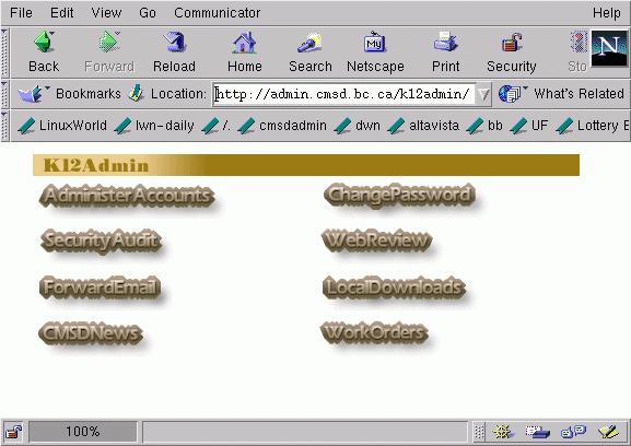 K12Admin was developed at Coast Mountains School District in British Columbia, Canada. It was originally used to administer the accounts in an NT domain. We needed a method for allowing staff in one school to create accounts for their school without accidentally messing with accounts from other schools. The web interface and database ran on a Linux machine, and account changes were made on the NT Primary Domain Controller using a TCP/IP connection. Soon after this, we set up a Linux server in each town to use as an authenticating proxy server. The Squid logs on each of these servers were copied to the main account administration computer and analyzed for potentially inappropriate use by scanning for a list of keywords in the URL.