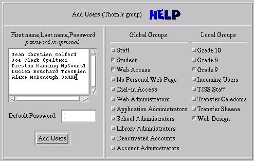 When accounts are created, each user ID can be assigned an individual password by the administrator, all accounts being created can be assigned the same default password, or random passwords can be generated for each account. Currently, the random passwords generated consist of a three-letter word, a single digit, plus another three-letter word (e.g., far6yet). With the word list I'm using, this results in a password space of just under 2,000,000 passwords. Not exactly the best security you could ask for, especially since my list of three-letter words is now quite public. I am considering adding an option to generate truly random passwords (such as “a5Tr43Zp”), but these are quite difficult for students to remember. It might be better just to instruct students (and staff) on good password-selection techniques and get them to change their assigned passwords right away. K12Admin has system-wide global groups that grant special-access privileges to users: