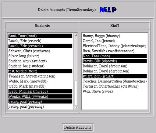 K12Admin is an account administration system designed specifically for K-12 school systems. It can be used to administer accounts on Linux servers in individual schools from a central location. The interface to the system is web-based. A teacher in a school who has been granted account-administration rights will be able to create student and staff accounts, delete accounts, create/delete local groups, modify the membership of local and global groups and change passwords within that one school.