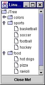 In other words, in standard Java, the event handler for a widget (e.g., determining what should happen when a button is clicked) is specified by passing an instance of a class which defines an actionPerformed method. This fairly cumbersome mechanism is necessary because Java doesn't allow passing function objects. JPython allows use of the simpler Python idiom of setting a callback attribute with a function object, and does the conversion on the fly. The rest of the program is fairly simple, and cheats only a little in that JTree, when called with no arguments, builds a sample tree automatically (see Demo/swing/treedemo.py in the JPython distribution for an example of how to build a tree from scratch).