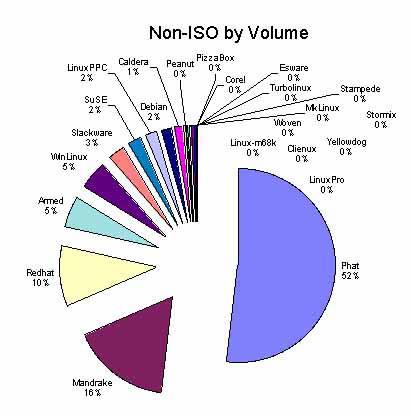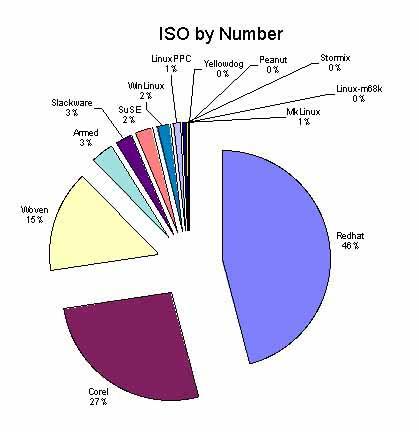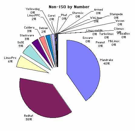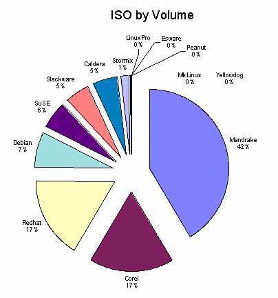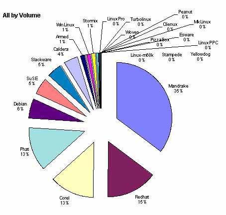 the Mandrake downflow from Tucows continues to be huge: still #1, though down 4% from January. Corel edged past Red Hat for #2, though both rounded to 17%. That's up 3% for Corel and down 1% for Red Hat. #4 Debian is up 2% and #5 SuSE is down 1%. Slackware was up 1%, Caldera held even, and Stormix showed up for the first time with a 1% wedge of the pie.