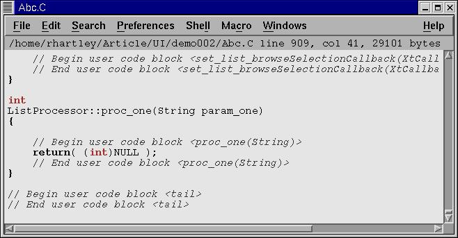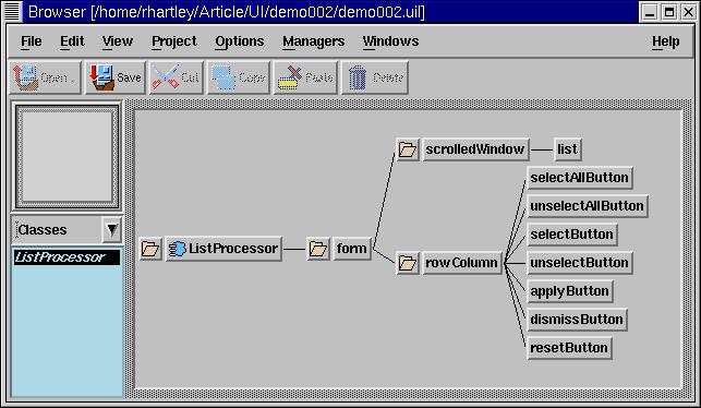 To create a class containing one or more widgets, select the highest-level widget to use, then select the “Make Class” menu option. In the previous widget tree containing a form widget with a few buttons and a scrolled list, I performed the “Make Class” operation, and now have a new component called ListProcessor which I can treat as a stand-alone component. It is much more than a simple widget, because we avoid having to delve into the depths of Xlib, Xt and Motif, remaining at a relatively high level without ever giving up control of any of the underlying widgets.
