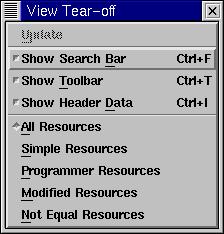 There are a number of options for displaying which resources are viewable. As can be done with all of the BX menu items, the “View” menu shown in Figure 4 has been “torn off” and displayed in its own window, making for a more efficient workspace. If the user has selected the “All resources” option, there can be more resources potentially available for viewing than what is easily scanned through. BX provides a resource finder that allows the user to enter a search string, and any resource containing it will be scrolled to and highlighted, as shown in Figure 5.