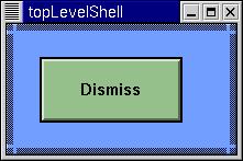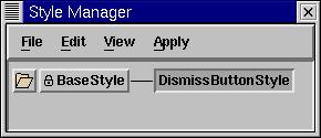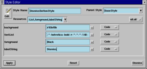 The styles manager in BX allows us to apply pre-set values easily to the resources of any number of widgets. Suppose, for example, we wanted a pushbutton with a label indicating “Dismiss”, a bold font, with a black foreground and a somewhat olive-colored background; we could use the style editor as shown in Figure 6. Saving this style to a DismissButtonStyle, our style hierarchy tree would look like Figure 7. When we create a pushbutton and apply the style, it would look like Figure 8.