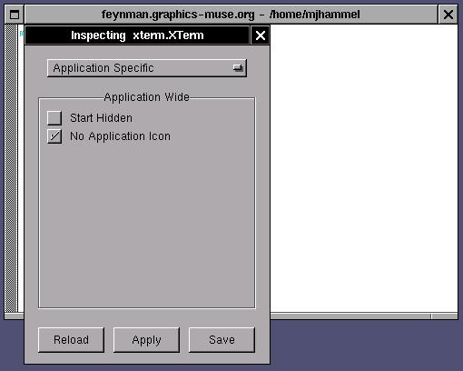 In the upper left corner of Figure 1 is the Clip. This is essentially the pager for Window Maker, although it lacks the visual cues that other pagers provide. It also has some special behaviors when used with appicons. Dragging an appicon onto the clip connects the icon to the clip for the current workspace (see Figure 3). After a moment, unless you keep the mouse over the clip icon, the icon you just connected to it will be hidden. This allows you to use drag-and-drop to place applications on a particular desktop, plus it hides all those nasty appicons. The clip is a tool for managing which applications are on which desktop.