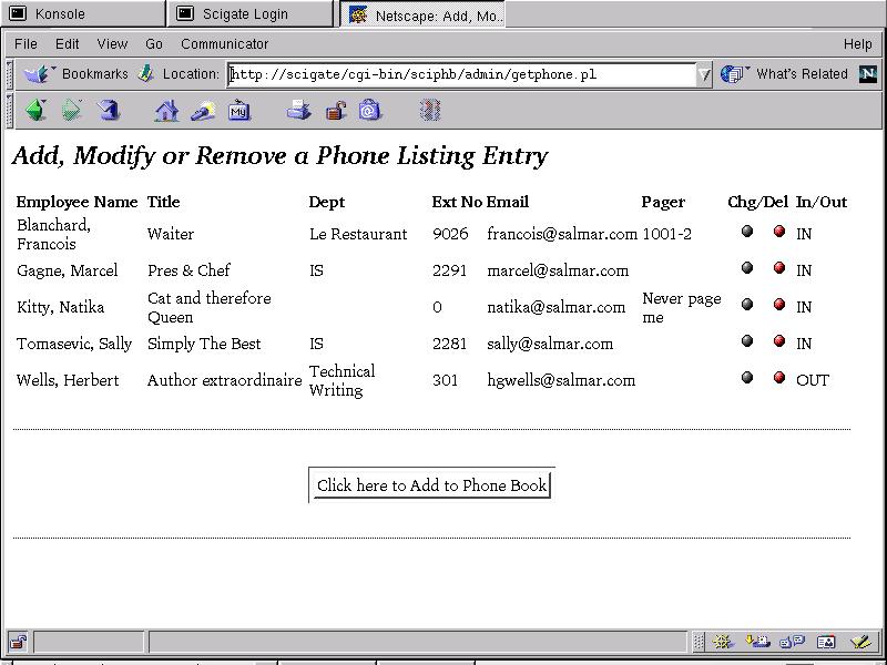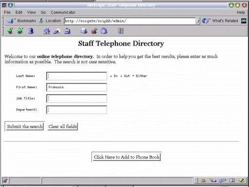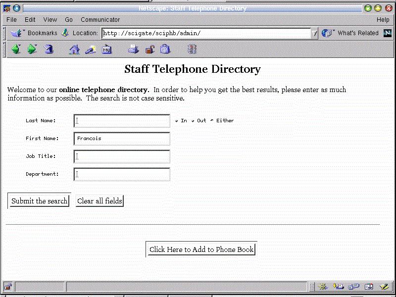 You might also consider changing the available fields. For instance, the IN/OUT board aspect of the directory may not be for you. Perhaps you need another field. With the scripts provided and a little time, modifying this telephone directory to suit specific needs should be quite simple.