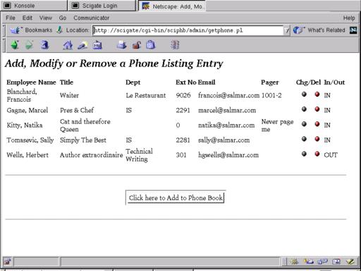 The phone book? But, of course. In fact, in honor of this month's issue celebrating “The People Behind Linux”, we are cooking up a web-based telephone book made with rich, yet low-calorie, open-source software and our secret ingredient, Linux. I think you will find the recipe quite enjoyable and practical too, non? What is the point of knowing all these people if you never talk to them? That is why François' mother insisted that her name be put in. I jest. Please sit, mes amis, while I show you how to create your own web-based telephone book, which is sure to become a centerpiece of your intranet. For added spice, this wonder of the intranet even provides an IN/OUT board.
