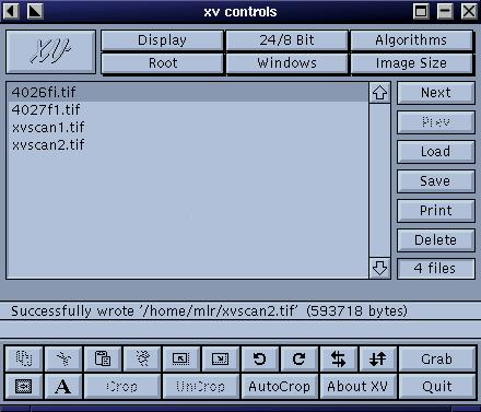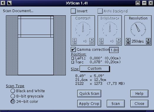So much for fun—that's about all you need to know to run xvscan, once you've learned the basics using xv. The problem is always what resolution to use for scanning. This, of course, depends on how you intend to use the scan. To use it only on your web site, there's no need to scan at any resolution higher than 72dpi, as that's as much as can be displayed on your screen. Scanning at a higher resolution will result in a great big file that will take a great deal of time to download, slowing down your site, and it won't look any better.
