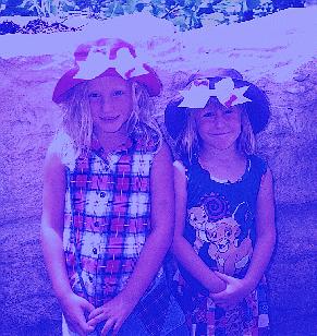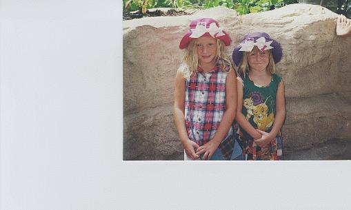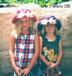 As you can see, part of the scanner bed was scanned as well as the picture. The area to be cropped is set in the same way as in xv: click the left mouse button in the upper left corner, hold it down while dragging to the bottom right corner, then release. Now click on “Apply Crop”, and the lines delineating the scanning area will decrease to the defined size. In this case, even with the gamma correction set, the picture is still a bit dark, so I turned off the gamma correction and set the contrast and brightness in order to lighten it up. Since the picture will change each time you change the values, I just played with different values until the picture looked right. The numbers I ended up using were +17 for contrast and +21 for brightness. I also clicked on the “sharpen” option under algorithms and added a label, showing that this picture of two of my granddaughters, Sarah and Rebecca, was taken in 1995. The result of all this fiddling is shown in Figure 3.