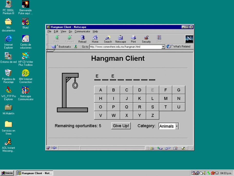 At the client side, a Java applet contained in a web page (originally obtained from a web server) is responsible for the application's graphical user interface (see Figure 4). The client platform may be any computer with a web browser that supports applets. The game's logic is not controlled by the applet; that's the middle tier's job. The client only takes care of the presentation logic: getting the user's input, performing some simple checking and drawing the resulting output.