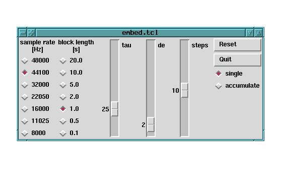 A window will pop up that looks like Figure 4. In this window, you can control the way the software measures the whistling sound from your microphone. You can change the sample rate (click on 44,100Hz) from left to right, the length of the analysed blocks (click on 1 second) and the parameters tau and de, which are needed for reconstruction of the phase space portrait from just one measured signal. This is comparable to the displacement of Figure 1; we have no velocity measurement here.