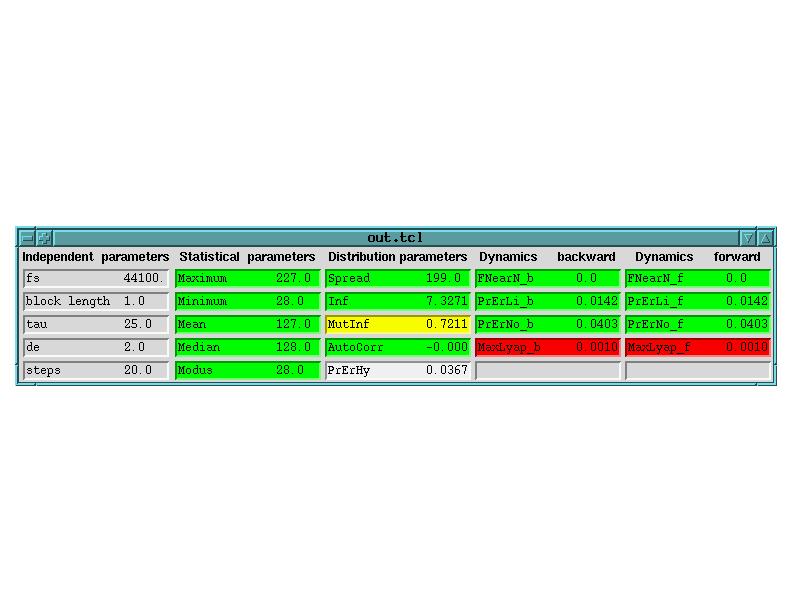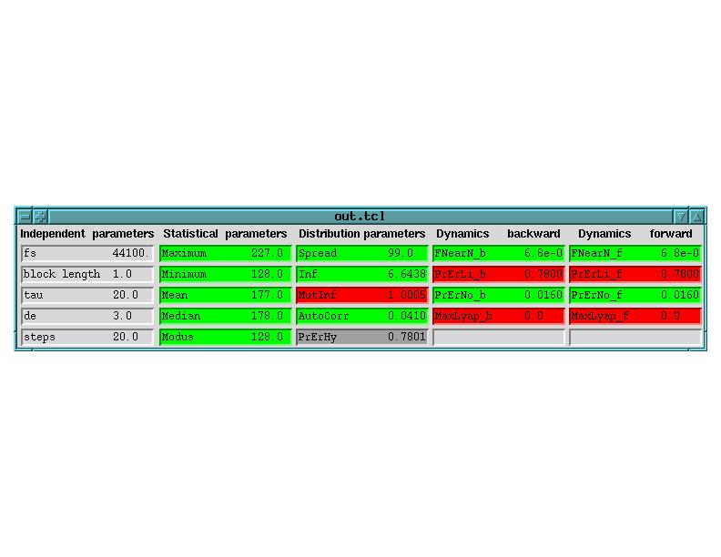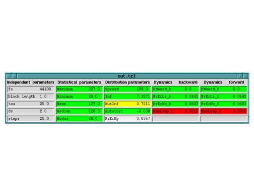 and the text lines will be converted into the more readable form of Figure 6. In the additional window popping up now, you will see several columns. On the left (in grey), the independent parameters of the first window are repeated. The second column from the left tells you if the loudness of the measured signal is well-adjusted to the sensitivity of your sound card's input. The general rule is, as long as there are red lines in the second column, you have to adjust sensitivity (with a separate mixer software) or loudness. Now, turning to the third column, we see more-advanced parameters: