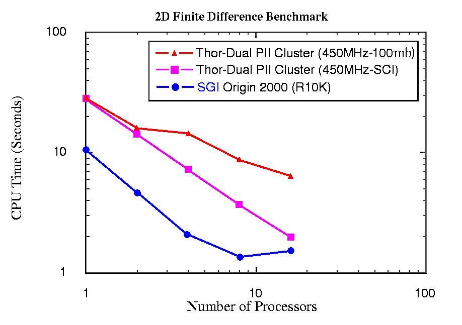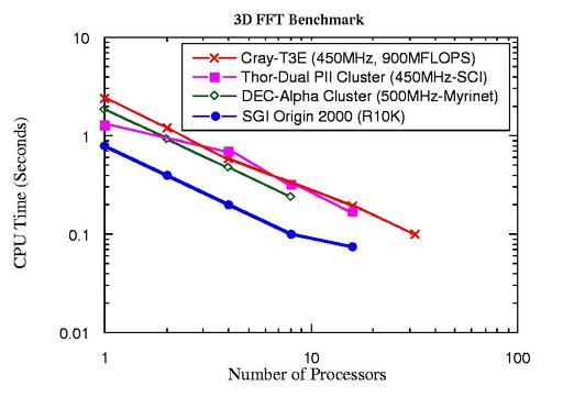 One of the THOR groups involved in Plasma Physics research has developed simulations that follow the motion of about 12 million charged particles. A portion of this code utilizes multi-dimensional Fast Fourier Transforms. We achieved nearly perfect scalability for up to 32 processors (all that was available at the time) on the THOR cluster. The code, following the MPI model, was easily transferred from an SGI Origin 2000 platform to the THOR Linux cluster. The performance of this program on THOR compared with other platforms as shown in Figure 3. Other benchmarks are given in Figure 4. At the time these benchmarks were performed, THOR consisted of only 450MHz machines.