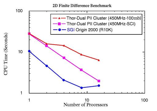 The second benchmark was obtained using the code developed to utilize the method of finite differences in the area of seismic modeling, and is written in C using MPI. In this case, the comparison was between the THOR multiprocessor using SCI interconnect, or 100 Mbp/s Ethernet and an SGI Origin 2000. The results are shown in Figure 4. As can be seen, the use of the SCI backplane/network fabric improves the performance of the THOR multiprocessor as compared to an Ethernet network solution. According to this benchmark, the performance of the THOR multiprocessor using SCI becomes comparable to that of the SGI Origin 2000 as the number of processors approaches sixteen.