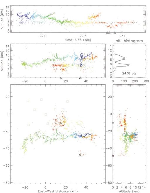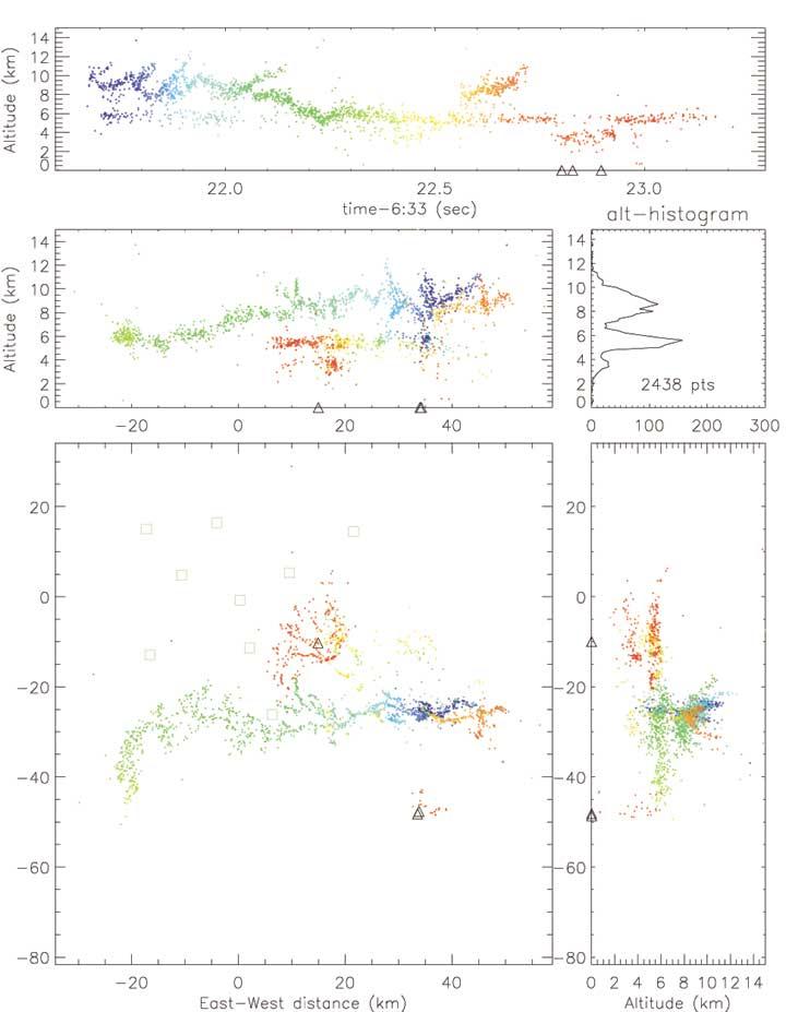 Figure 1 demonstrates observations of a horizontally extensive lightning discharge from a storm over central Oklahoma on the evening of June 10, 1998. The discharge occurred over the southern edge of the measurement network and had an overall extent of 75km. The flash began as an intracloud discharge between the main negative and upper positive charge layers of the storm. Subsequent breakdown in the negative charge level continued the discharge to the north, where it produced a negative-polarity stroke to ground. This discharge, which lasted approximately 2.5 seconds, produced more than 2400 located radiation events and demonstrates the LMA's ability to determine discharge structure at the individual flash level. The different panels show plan view, east-west and north-south vertical projections and height-time plots of the lightning activity. The color scale in this example represents the progression of time, blue being early in the flash and red being late (linear scale). The small boxes on the plan view detail the locations of the measurement stations.