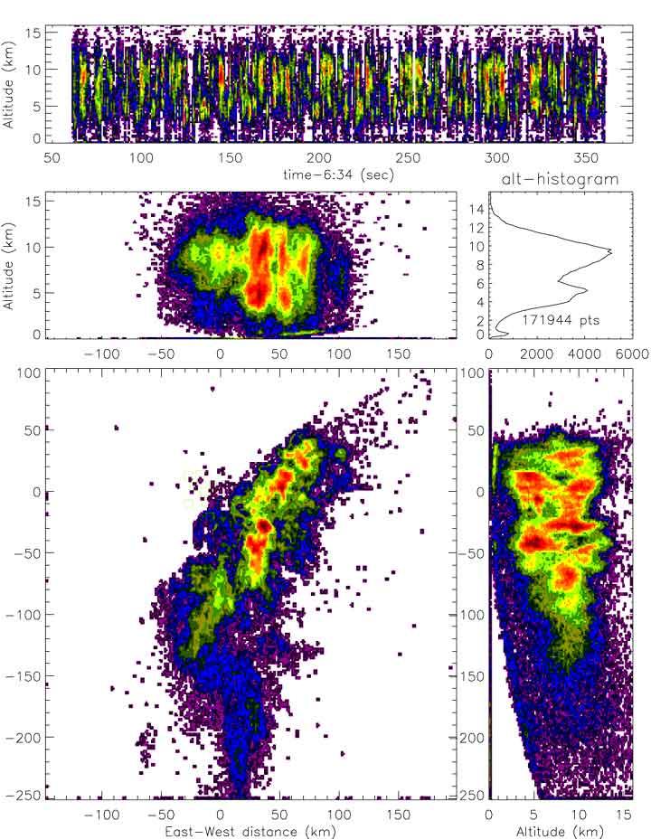 Figure 2 demonstrates the LMA's ability to view storms on much larger scales. This example is an integration of five minutes of data, where the color scale now represents event density, red being the highest activity and purple the lowest (logarithmic scale). Data of this type helps to determine the location of the main conective cells in storm systems, as well as determine the overall size and structure of the storm.