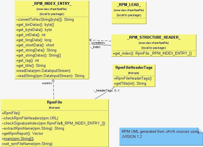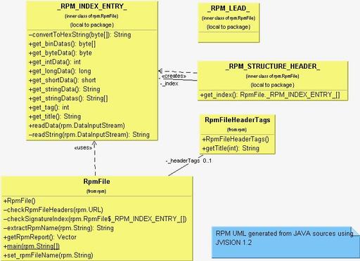 • Once the _RPM_LEAD_ has been validated, the RpmFile class instantiates an _RPM_STRUCTURE_HEADER_ class, which is used to check the RPM file header content. The header content consists of multiple _RPM_INDEX_ENTRY_ stored in an internal array. Each element of this array represents a piece of header information which will be made available later via the get_rpmReport method. Since there is no reason to make those classes visible to mere mortals outside the RpmFile, they have been implemented as internal Java Classes inside the RpmFile class. A more precise UML graph is provided in Figure 3. I used the JVision 1.2 tool to automatically generate the UML class diagram from the Java source code. JVision is a very interesting, easy-to-use tool from Object Insight (http://www.object-insight.com/). This tool is able to automatically generate UML diagrams from Java source classes. Although not free, the license price is reasonable compared to other products. I have been using it for more than one year now, and it helps me in producing Java project documentation. A Linux beta version (free for non-commercial use) of the product is available on the Object Insight web site.