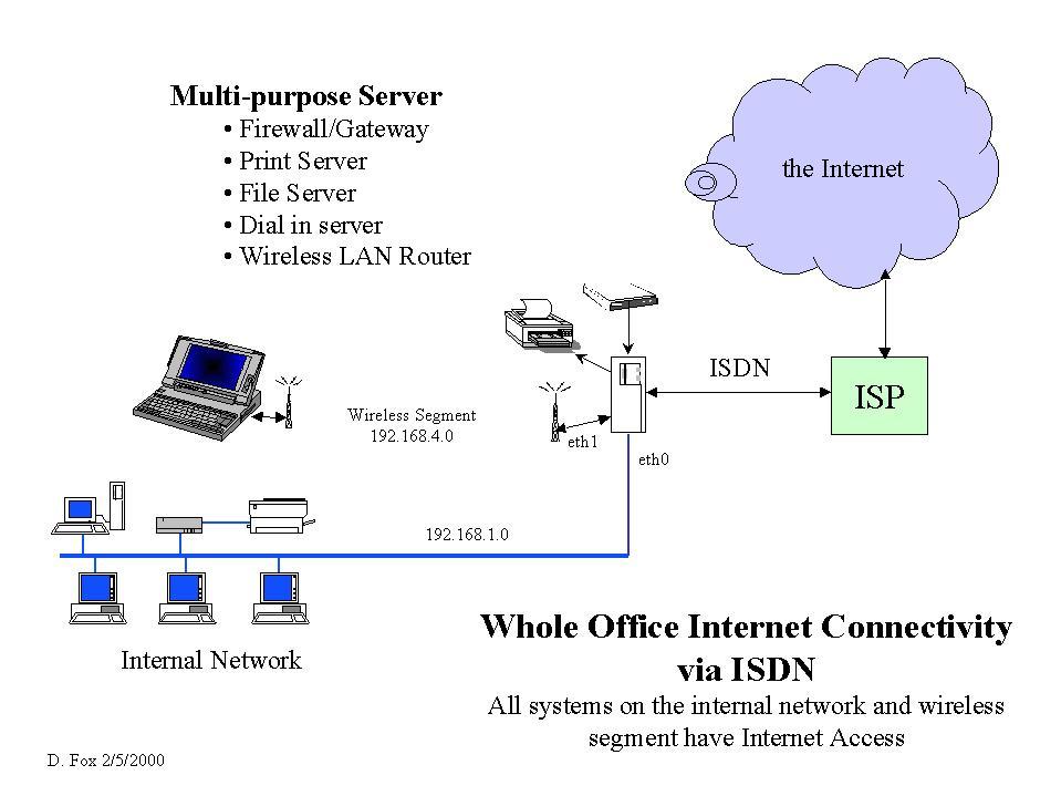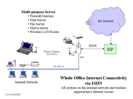 The existing network operates on the private class C network 192.168.1.0. The Linux server provides IP masquerading for all systems on the internal network through an ipfwadm firewall and diald support for an ISDN connection to the Internet. I am currently running Debian 2.0 with kernel 2.0.34 on the server. I chose to use 192.168.4.0 as the network number for the new wireless segment.