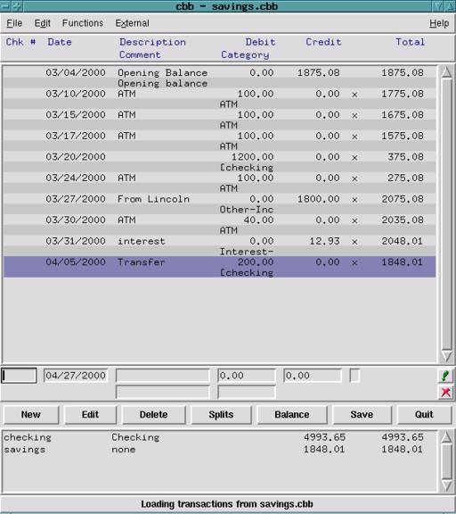 cbb keeps account information in individual files, one .cbb file for each account. A list of accounts and their current balances is displayed at the bottom of the screen, and the account's entries are shown when you select it (see Figure 1).