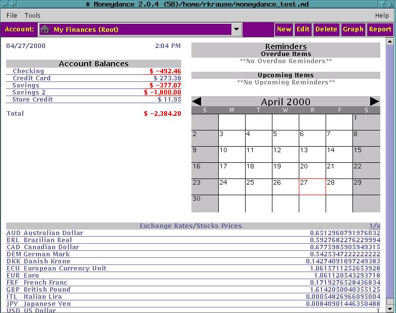 GnuCash is the most ambitious financial program being developed at this time. It offers the greatest variety of account types, sub-accounts and stock price retrieval. This program was the most difficult to compile and get working because it depends on quite a few other programs, libraries and Perl modules. I looked at both the stable version (1.2.5) and the current development version (1.3.6).
