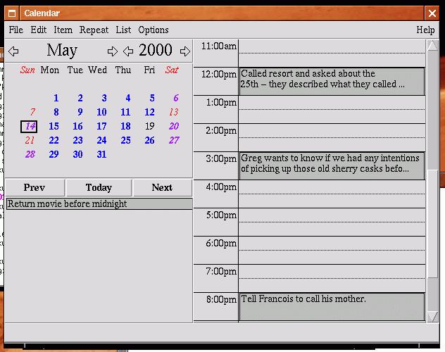 Yellow sticky notes are fine and quite frankly, I have found them to be extremely useful on a number of occasions. Unfortunately, they do not offer the flexibility of a planner or calendar. Once again, with your Linux system, you are ready and able to better start planning your life. If you are running GNOME, you can use the program gnomecal to keep yourself organized. KDE users have korganizer to keep them focused. We focus a great deal on both KDE and GNOME users, since desktop applications tend to be designed with ease of use in mind. However, GNOME and KDE are not the only alternatives, and many people use lighter, faster desktops. (For this article, I have been using Window Maker as my window manager.) To those looking for a nice cross-desktop alternative, I recommend ical, a clean, simple X window calendar program.