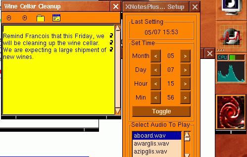C'est vrai. There is a plus sign at the end of that command. The application appears with a nice little Window Maker-like icon which you right-click to do various things (it has a little swirl that looks sort of like a galaxy). Among the features you'll find (other than covering your virtual desktop in yellow) is a Palm Pilot sync utility, the ability to print envelopes from your address book, set alarms with little musical reminders, e-mail notes, or, if you really don't want to clutter your desktop, you can even hide the notes.
