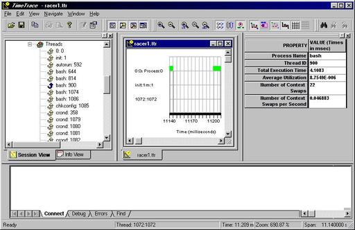 TimeTrace (Standard Edition) for Linux/RT provides the ability to visualize and profile one Linux/RT host running real-time programs or applications. An example of the TimeTrace interface is shown in Figure 2. TimeTrace sits on its own platform and provides a graphical user interface (GUI) presentation of the monitored host. With TimeTrace, you can view scheduling, context-switching, system calls and user events. According to the vendor, TimeTrace makes your real-time task's worst-case and average execution times, and period information, available. The Professional Edition of TimeTrace can monitor multiple Linux/RT hosts.