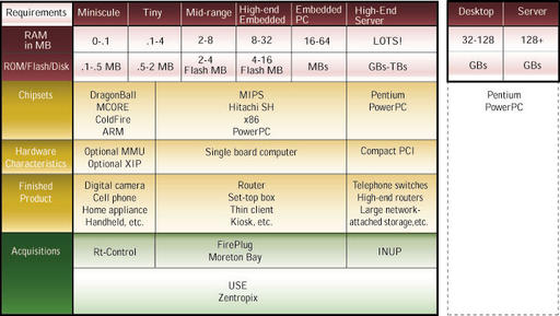 Lyle Ball, VP Marketing for Lineo, says, “The important thing is that, while the desktop and server areas are familiar territory, the rest of the world—the embedded device world—is not. There is a lot of existing expertise everywhere on this chart, but when you get down to the finished product level, that's where you've got the feudal system that Linux and these other developments begin to eliminate.”