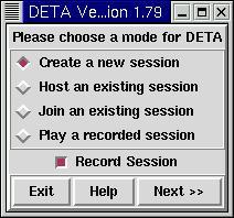 When the user first starts DETA, he or she is given four mode options, as seen in Figure 1. The first is to create a new session. This creates a new multicast session that will be announced while the session is active, and which will expire after the session becomes inactive. By creating the session, the user becomes the designated host of that session. The second option is to host an existing session. This mode is included so that users can host permanently existing sessions. At NC State, a session directory server was written by Troy Holder that continuously announces class sessions. In this way, semester-long class announcements do not have to be re-created at every meeting. The third option is to join an existing session. This is the option that a remote participant would select. It allows the user to select a desired session from a list of available sessions and then join it. The last option is to play a recorded session. This mode is used to select a previously archived session for playback via a remote VCR server. Once the mode is selected, the user enters information about the session. Figure 2 shows the information required when creating a new session. This includes the name of the session, the lecturer name, and the MBone tools to use in the session. This is saved between sessions and usually doesn't need to be re-entered. Once the options for the session have been set, DETA creates the session and loads the MBone tools.