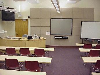 North Carolina State University has been running MBone classes since the fall of 1996. In this time, a number of undergraduate engineering courses have been delivered to participating universities and community colleges. At NC State, a classroom was constructed specifically for distance education (see Figure 5). This classroom contains seating for local students. There are two remote-control video cameras, one for the lecturer and one for the students. There are three large television monitors on which the computer screen is shown to the local students. There is a control area with a computer workstation, document camera, two small TV monitors and an AMX controller. The AMX controller controls the cameras as well as the other audio and video sources. It also provides a central control to operate the other equipment in the room. The most innovative feature of the classroom is a digital projection SMARTBoard mounted on the front wall of the classroom. The SMARTBoard is an input device manufactured by SMART Technologies. It is essentially a touch-sensitive version of a standard office whiteboard. Whatever is written on the surface of the SMARTBoard is transmitted to the computer. The projection version used in the classroom works in combination with an LCD projector to project an image of the computer screen directly onto the SMARTBoard. In this way, the lecturer essentially writes directly on the computer screen. The SMARTBoard is large enough that the local students see directly what the lecturer is writing on the SMARTBoard. This technology provides a natural closed-loop interface to the computer that closely parallels the traditional classroom blackboard.